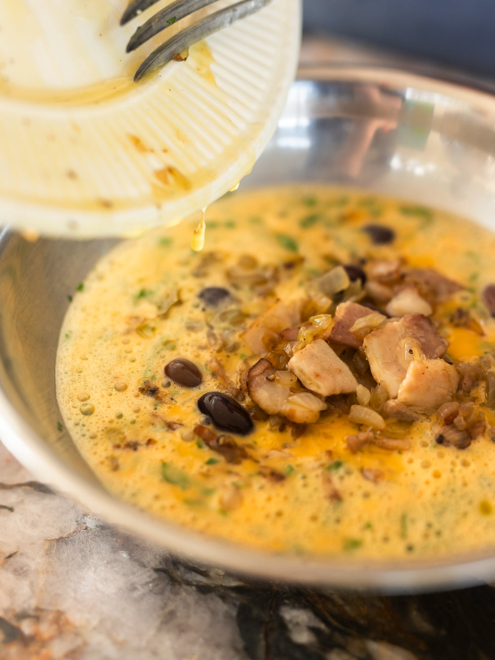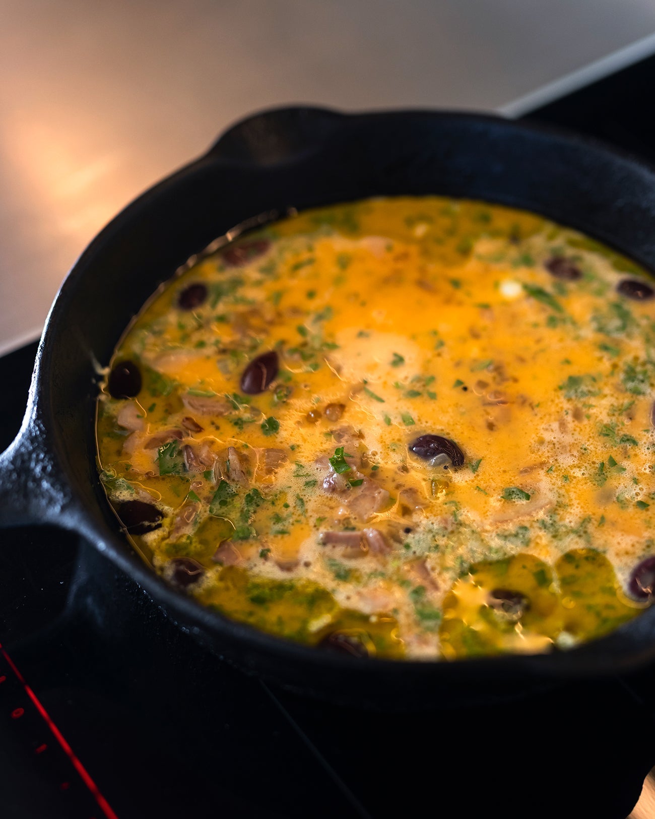 Add the cooled onion mixture, parsley and olive to the eggs, season and mix well.
